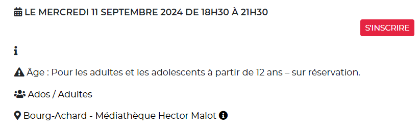 Vous pouvez sélectionner la localisation "Bourg-Achard - Médiathèque Hector Malot" dans la recherche à droite de l'écran afin d'accéder uniquement aux évènements de la médiathèque de Bourg-Achard.
