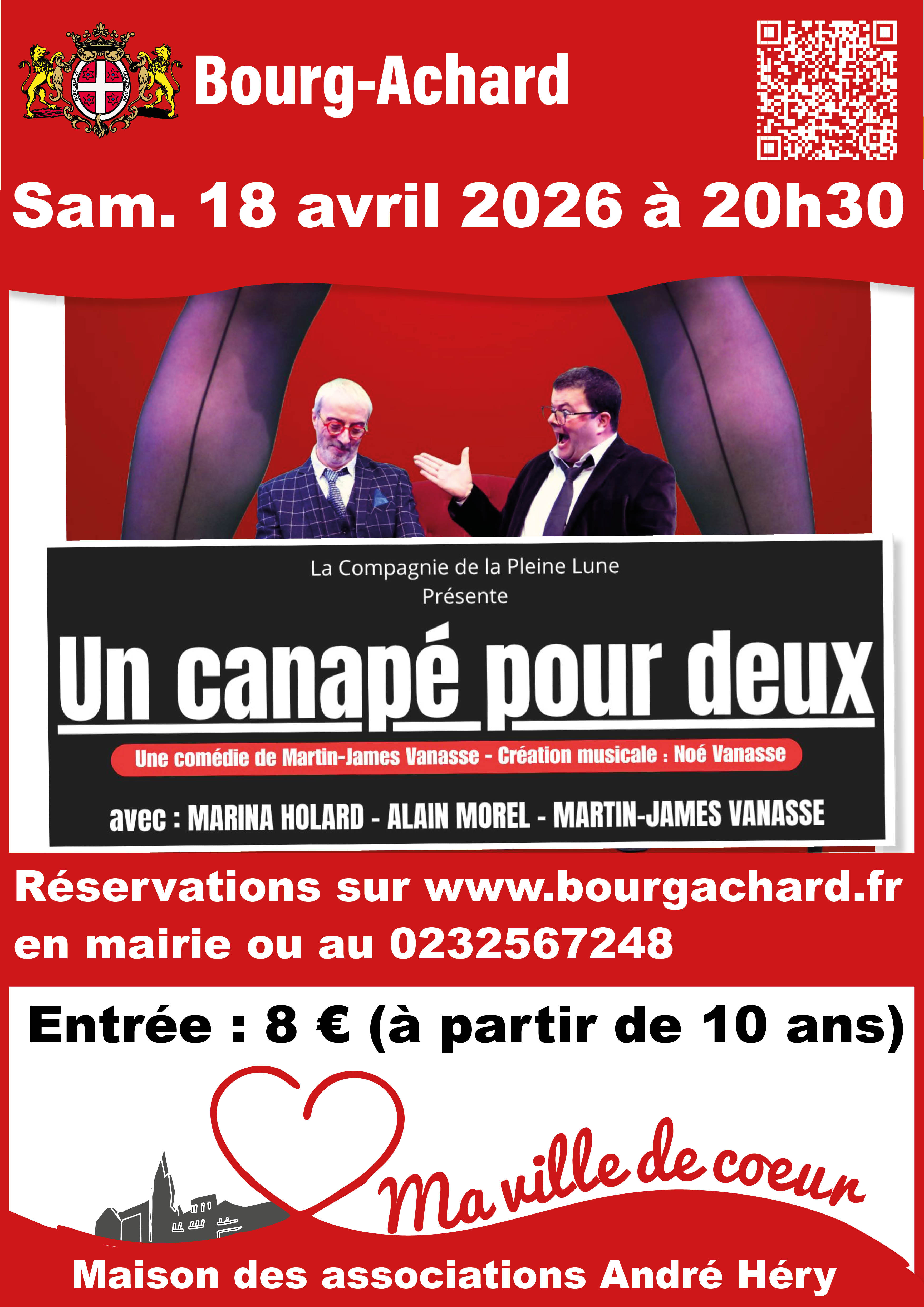 La compagnie de la Pleine Lune sera en représentation avec son nouveau spectacle « Un canapé pour deux », le 18 avril 2026, à 20h30, à la maison des associations André Héry, rue Pierre et Marie Curie, à Bourg-Achard.