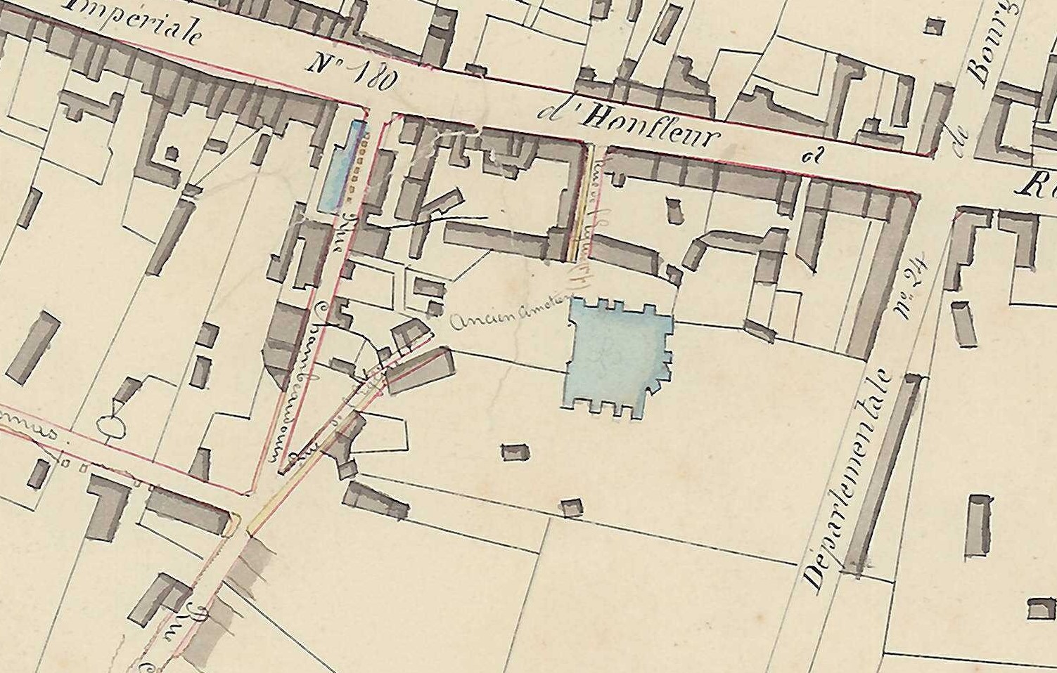 Cette croix en métal du 19e siècle a été placé sur ce socle du 15e siècle pour symboliser l'emplacement de l'ancien cimetière du prieuré. En 1857 au moment du relevé des rues de Bourg-Achard en prévision des grands travaux, le cimetière était déjà mentionné comme ancien. En effet le cimetière a du etre  translaté vers son lieu actuel à cette époque.  la croix de cimetière est un ornement funéraire qui a été imposé à partir du 16e siècle par le concile de Cambrai pour rappeler aux visiteurs le caractère sacré du lieu.