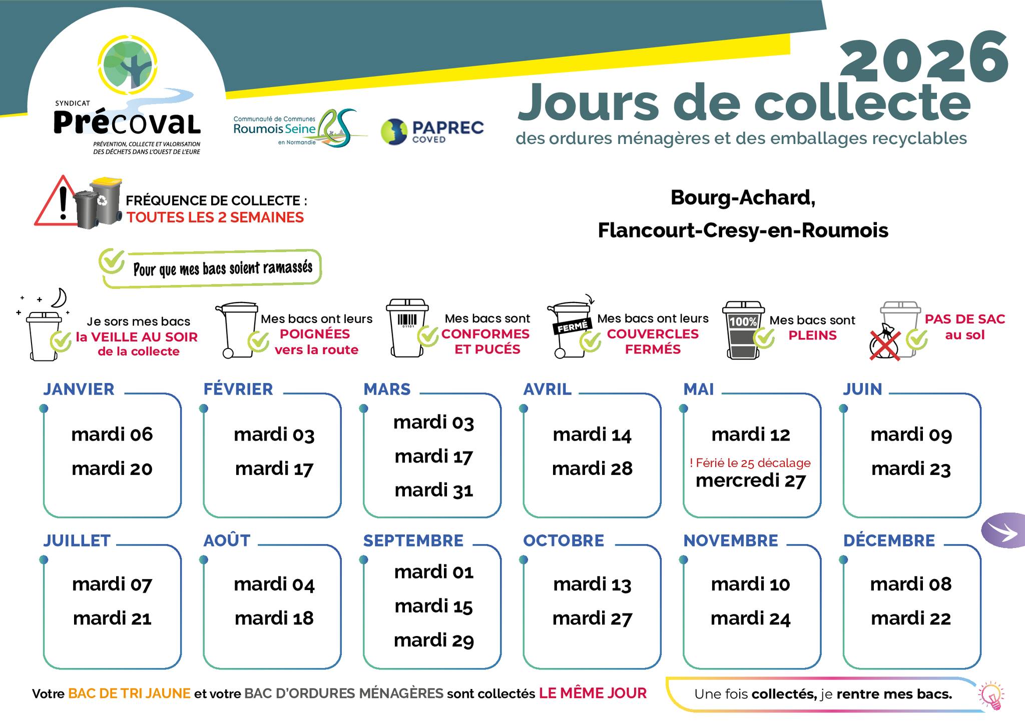 Quelques lieux à Bourg-Achard disposent toujours de sacs jaunes dû au fait qu'ils ne peuvent pas recevoir de bac jaune.
